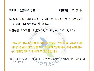 공공 CCTV 최초 클라우드 AI V-SaaS CSAP인증 취득! 당사의 클라우드 CCTV 영상관제 솔루션(The N)이 최근 한국인터넷진흥원(KISA) 등 관련 기관의 클라우드 보안인증 심의를 성공적으로 통과하였습니다. 이번 성과는 서비스의 고도화와 보안 수준 향상을 위해 밤낮없이 노력해주신 V-SaaS팀을 비롯한 모든 임직원 여러분의 헌신과 열정의 결과…