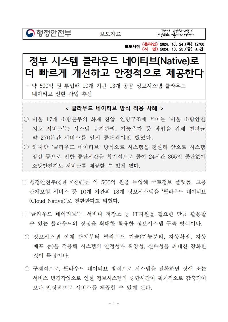 정부 시스템 클라우드 네이티브(Native)로 더 빠르게 개선하고 안정적으로 제공한다 2025-11-05 0 2 11.05 11:45 정부 시스템 클라우드 네이티브(Native)로 더 빠르게 개선하고 안정적으로 제공한다