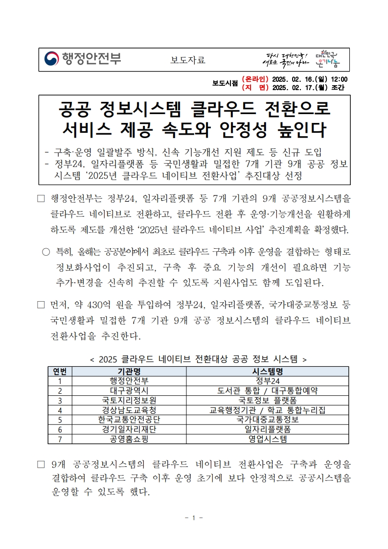 공공 정보시스템 클라우드 전환으로 서비스 제공 속도와 안정성 높인다 2025-11-05 0 5 11.05 11:50 공공 정보시스템 클라우드 전환으로 서비스 제공 속도와 안정성 높인다